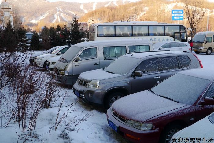 步出旅館看見停車場的車子都積了一層新雪