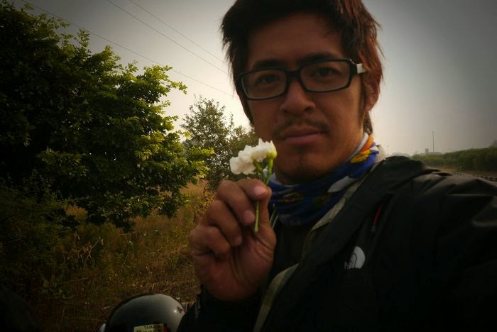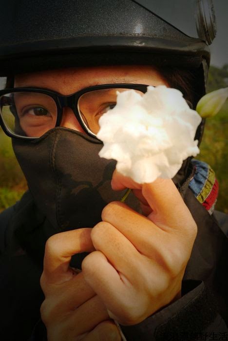 摘了一朵花放在口袋旁當裝飾,相當有喜感