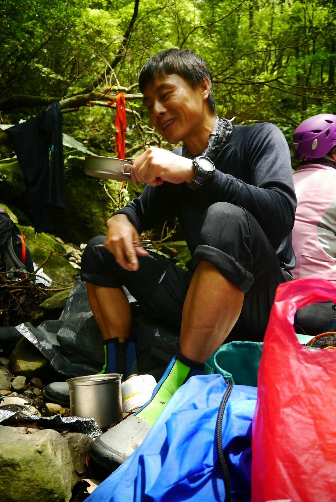 下到溪床之後稍事休息脫下雨鞋換上朔溪鞋