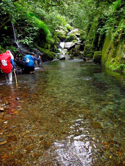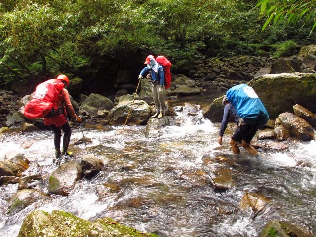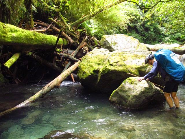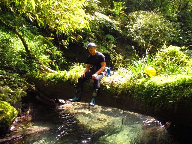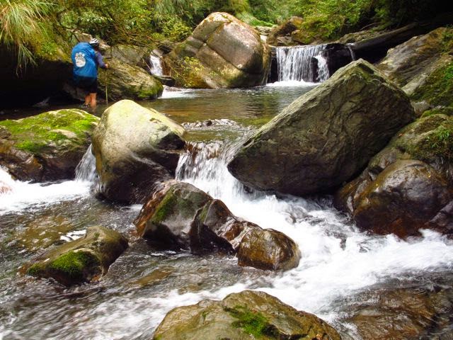 換上溯溪鞋之後走在濕滑的溪床多了好幾分安全感