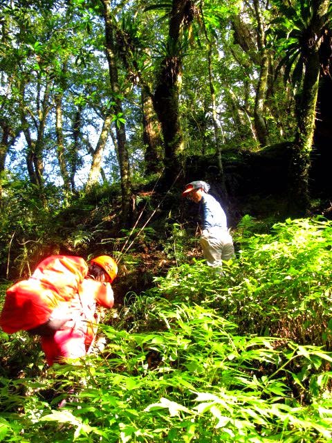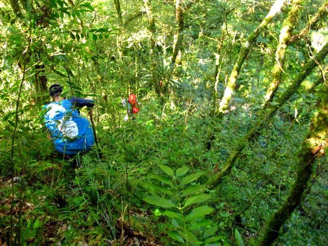 找到的稜線入口近乎垂直,一路依靠樹木當作抓點以及踩點將自己與背包往上送