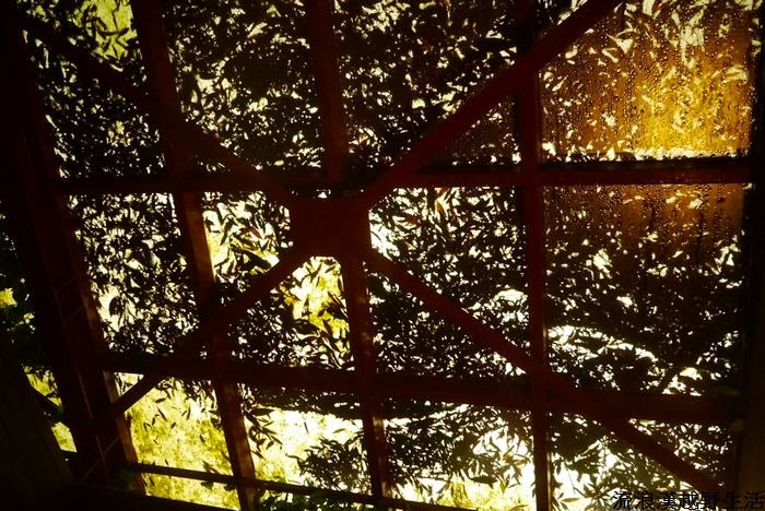陽光透過透明玻璃與落葉相映出的光影壁畫